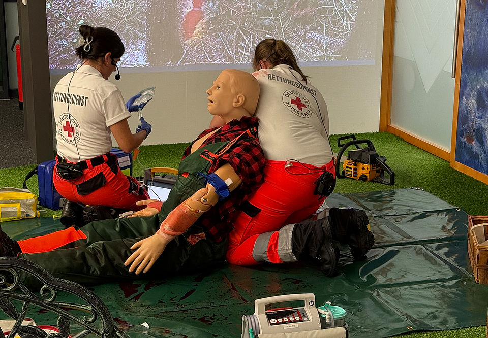 Grill und Gartenmöbel lassen hier sofort Sommergefühle aufkommen. Hier simulieren wir häusliche Notfälle in der Freizeit und im Garten. Zusammen mit der Medienwand sind aber auch Einsatzbeispiele in der Natur, wie z. B. am Badesee oder im Wald, möglich.